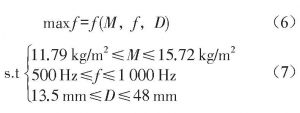 對隔聲腔D進行優化時, 選取的噪聲頻率范圍應與2.1節所確定的電容器底部噪聲貢獻頻率范圍相同。下面對隔聲腔尺寸D進行優化, 選取隔聲腔尺寸D和噪聲頻率f和面板質量M為設計變量, 生成可接受的隔聲腔直接聲振耦合響應模型, 并建立目標函數, 優化問題的數學表達式為